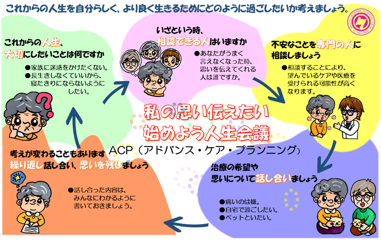 | アドバンス・ケア・プランニング(ACP)とは、将来の変化に備え、将来の医療及びケアについて、患者さんを主体に、そのご家族や近しい人、医療・ケアチームが、繰り返し話し合いを行い、患者さんの意思決定を支援するプロセスのことです。患者さんの人生観や価値観、希望に沿った、将来の医療及びケアを具体化することを目標にしています。 |